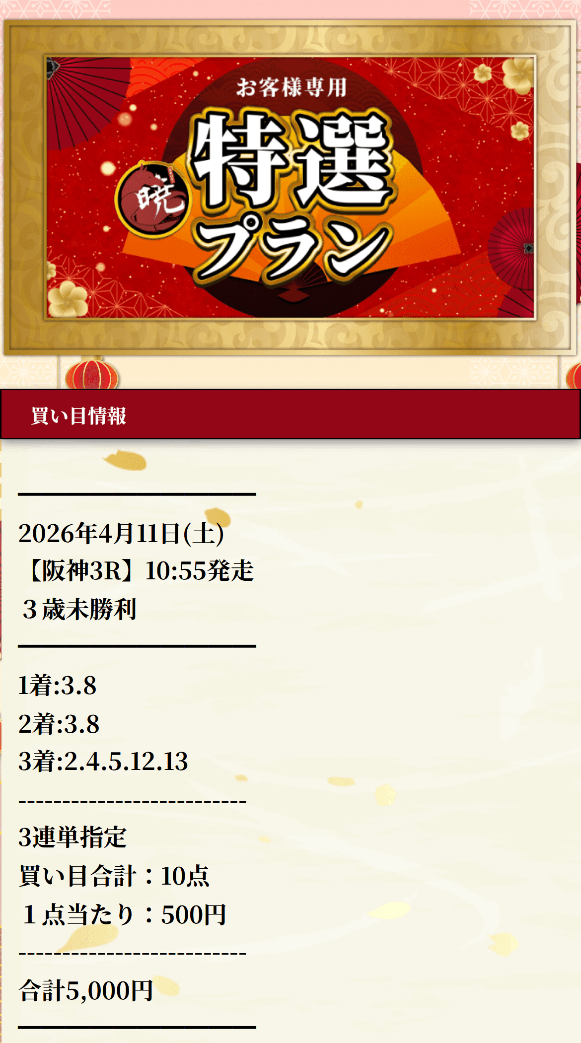 暁の特選プランは阪神3Rで、勝った3番は1番人気でも、そこから先をただ本命寄りにまとめずに、2着8番人気、3着6番人気までちゃんとつないで、最終的に配当額20万7600円。こういうのって「1着は見えてた」で終わらないんですよ。相手の拾い方が雑だとすぐ崩れるのに、そこを崩さずに三連単415.2倍まで持っていくのは普通に上手い。派手さだけじゃなくて、ちゃんと買い目の中身で納得させてくる感じでした。
