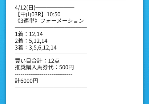 これはかなり嬉しかったです。正直、朝のレースってそこまで期待しすぎないようにしてるんですが、アクセラレータはそういう油断をいい意味で壊してくれました。4月12日の中山3Rで結果は12→14→5。3連単は75,850円で、画像どおり6,000円入れていた自分は379,250円になりました。しかも1着の12番は6番人気。こういうところを頭で持ってきてくれると、「はいはい人気どころね」で終わらないから気分がいいんですよね。アクセラレータって名前の通り、午前中の空気を一気に変える力がありました。あの日はそのまま一日中、財布の中まで軽くならずに済みました。