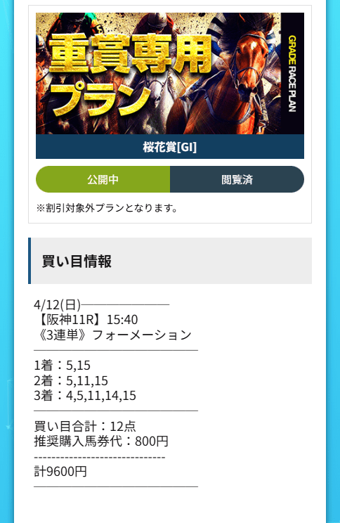 美容室を1人でやっているので、売上が読みにくい週ってやっぱり気持ちが落ちるんです。だから大きいレースの日でも、前みたいに感情だけで買うのはやめて、最近はちゃんと情報を見て決めるようにしています。今回の重賞専用プランは、桜花賞でしっかり15→5→11を取ってくれて、3連単は82,710円。私は画像の通り9,600円入れていたので、払戻は661,680円になりました。こういう金額って、ただ「当たった」で終わらなくて、月末の支払いとか、仕入れとか、現実の不安を一気に軽くしてくれるんですよね。派手な言い方をしなくても、重賞専用プランは「ちゃんと残る結果」をくれた、という感じでした。